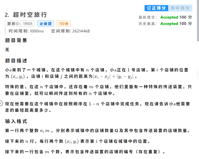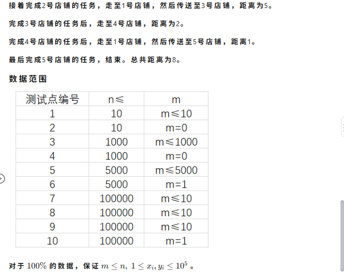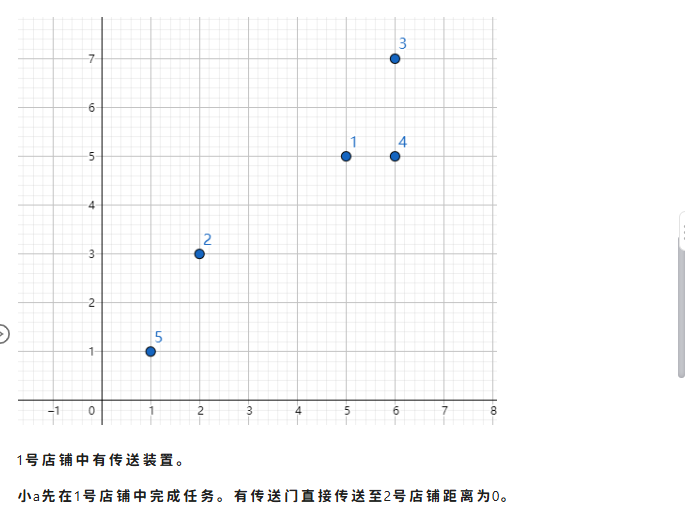 接着第二题,以为是个搜索,但是他有要求,所以我就枚举每个任务,看看是走过去快还是传送快,传送是哪个店铺快,统计起来即可