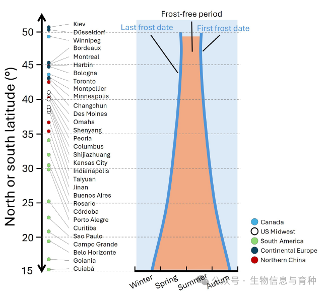 全球主要玉米产区的主要城市地理位置图。图中显示了不同纬度下的潜在玉米生长季长度(无霜期)