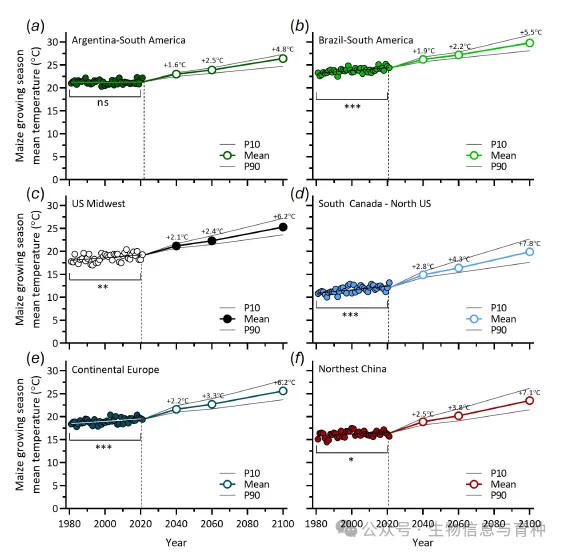 1980-2021年全球主要玉米产区生长季平均气温的历史和预测变化。