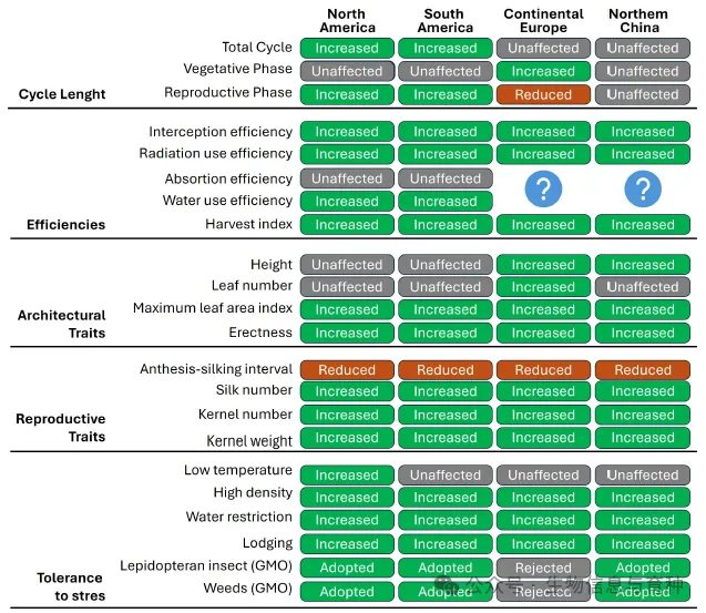 过去50年育种和转基因计划在不同全球地区引入的周期长度、决定产量的效率、株型特征和耐逆性变化。