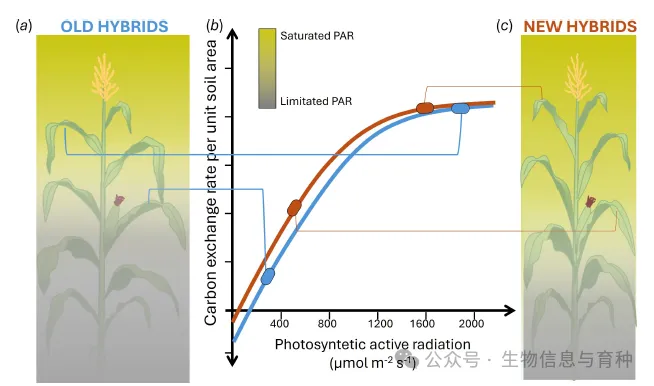 与旧杂交种相比,新杂交种的辐射利用效率提高。新杂交种的株型减少了同时出现强光饱和和强光限制的叶片层的可能性。