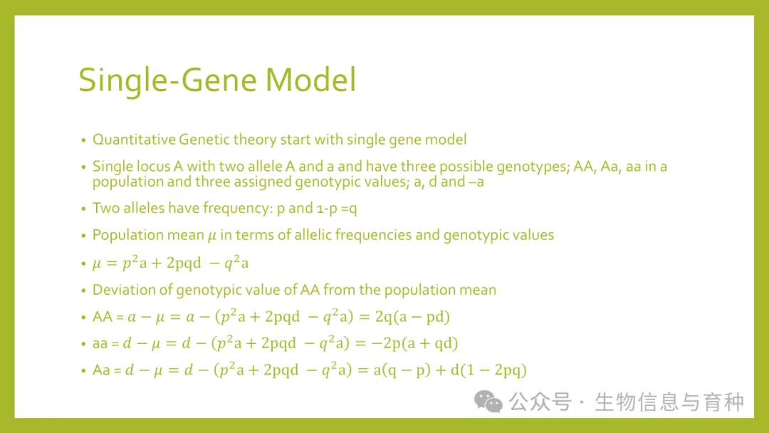 - • 单基因模型是数量遗传理论的起点,假设一个基因位点有两个等位基因(A和a),形成三种基因型(AA、Aa、aa)。