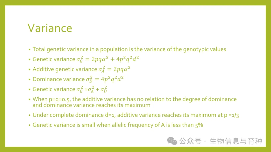 - • 当等位基因频率为0.5时,显性方差最大;加性方差在完全显性(d=1)时于p=1/3达到峰值。