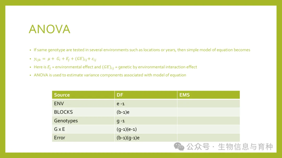 - • 方差分析(ANOVA):用于估计基因型、环境及其互作的方差分量。