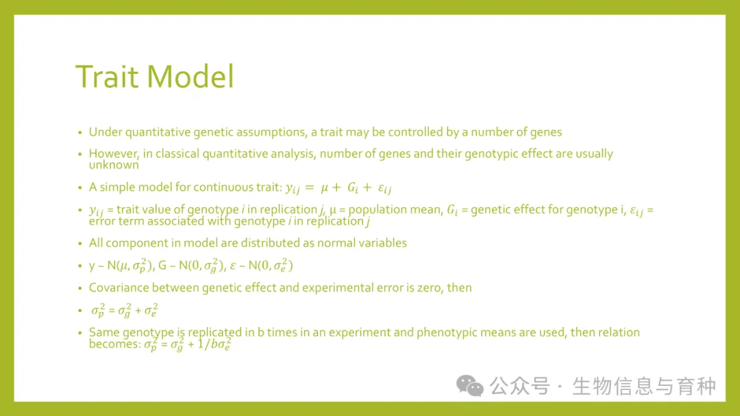 - • 基本模型:性状值 = 群体均值 + 基因型效应 + 环境误差()。