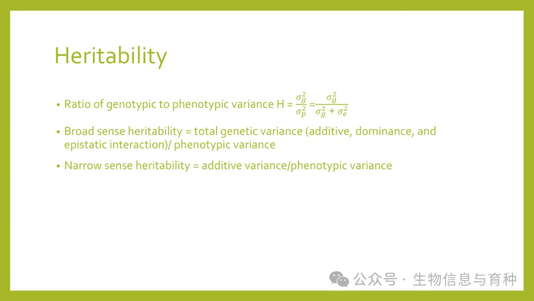- • 狭义遗传力():仅加性方差占比,对育种选择更关键。