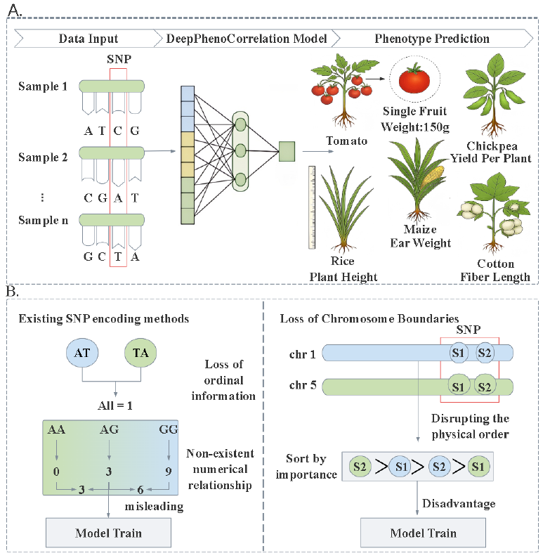 图1:(A)DPCformer在作物基因组预测中基于SNPs的工作流程。(B)现有方法的局限性。