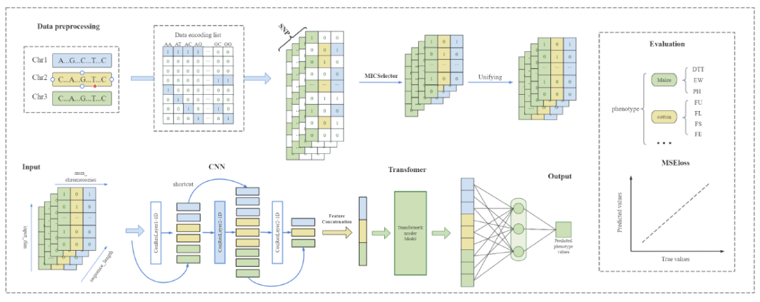 - • DPCformer模型:提出了一种结合卷积神经网络(CNN)和自注意力机制的新型深度学习模型,用于从SNP数据中预测作物表型。