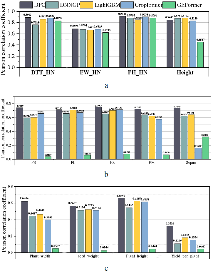 - • 鹰嘴豆数据集:在单株产量性状上,DPCformer的PCC比类似模型提高了高达16.62%。