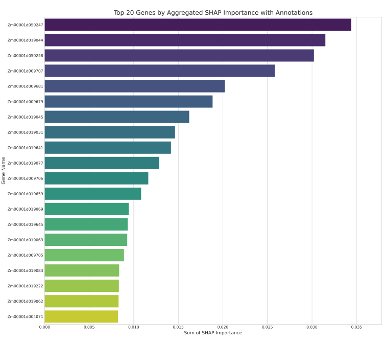 - • 模型可解释性分析:使用SHAP值对模型预测进行解释,识别出与玉米株高和穗重性状相关的几个候选基因,如Zm00001d050247(编码WRKY转录因子)和Zm00001d015381(编码MADS-box转录因子ZmMADS17),这些基因与植物高度和花的器官发育相关,从而影响玉米穗重。