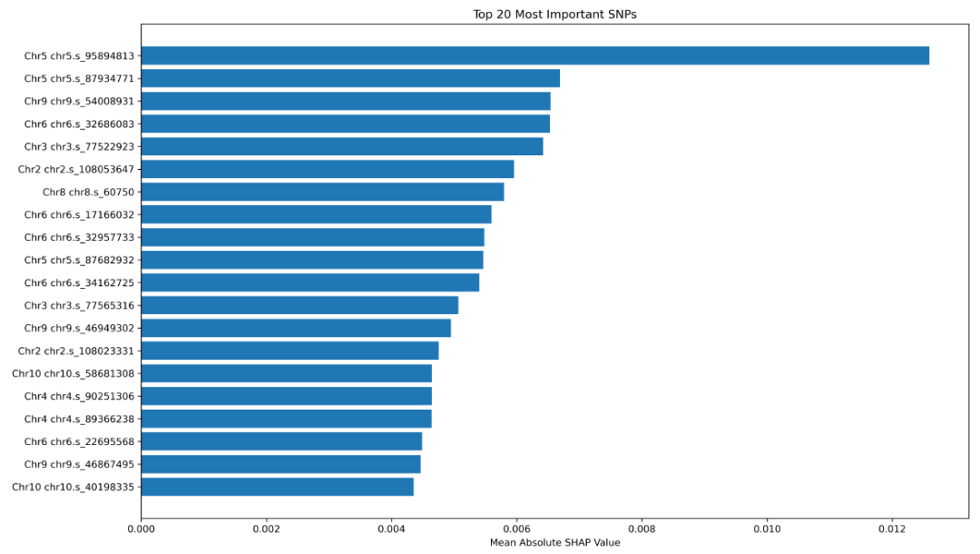 图5:基于玉米穗重(EW)性状计算SHAP值后获得的前20个显著SNP。
