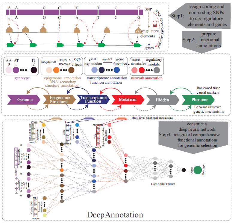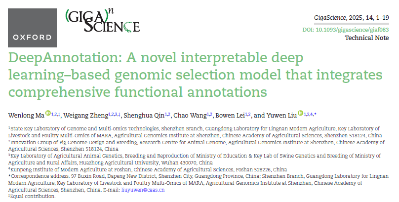 分享一篇2025年8月28日由中国农业科学院深圳农业基因组研究所刘毓文课题组在《GigaScience》上发表题为“DeepAnnotation: A novel interpretable deep learning–based genomic selection model that integrates comprehensive functional annotations”的研究论文。该研究开发了一款一种名为 DeepAnnotation 的新型可解释深度学习方法,用于整合多组学功能注释进行基因组选择(GS),以提高农业动植物复杂性状预测的准确性和生物学可解释性。