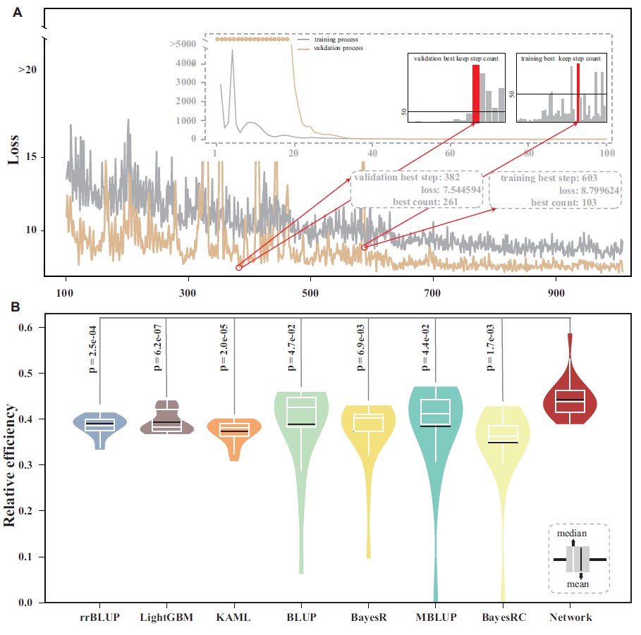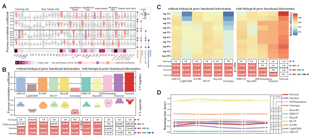 - • 在独立测试集上表现稳定,训练时间与rrBLUP等模型相当。