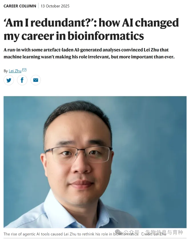 分享一篇2025年10月13日来自Nature的职业专栏文章,题为《“我是否多余了?”——人工智能如何改变我在生物信息学的职业生涯》,作者是Lei Zhu。文章探讨了人工智能工具在生物信息学领域的崛起如何重塑研究者的角色,尤其是从“代码编写者”转变为“AI监督者”的过程。