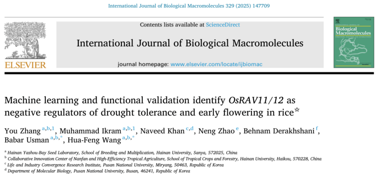 分享一篇近期由海南大学王华锋教授团队发表在International Journal of Biological Macromolecules(IF=8.5,JCR1)上的文章:Machine learning and functional validation identify OsRAV11/12 as negative regulators of drought tolerance and early flowering in rice。研究通过机器学习与功能验证相结合,成功鉴定出OsRAV11/12为水稻干旱胁迫响应和开花时间的负调控因子,为理解植物胁迫与发育的交叉调控机制提供了新视角,也为耐旱作物育种提供了潜在基因资源。