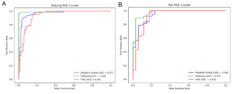 - • XGBoost表现最佳,测试集准确率达90%,AUC为0.97。