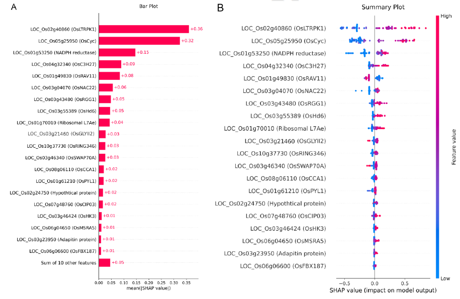 - • SHAP分析显示 OsRAV11 表达越高,干旱耐受性越差,提示其为负调控因子。