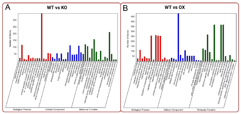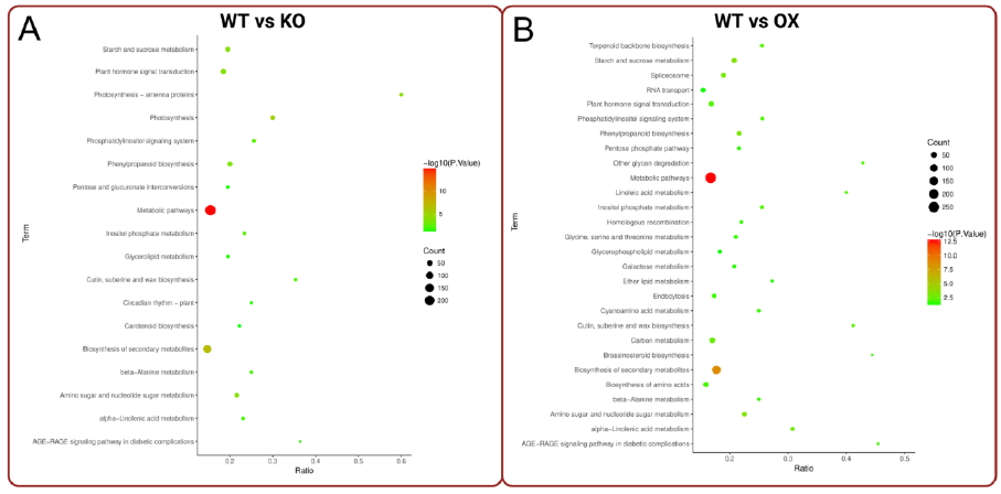 - • KO植株上调胁迫响应、蛋白折叠、ABA信号通路相关基因。