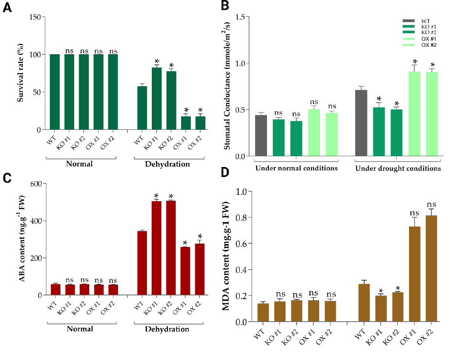 - • 对野生型(WT)、KO、OX植株进行干旱胁迫处理,评估其表型、生理指标(如气孔导度、ABA含量、MDA水平)及转录组变化。
