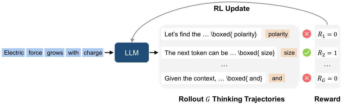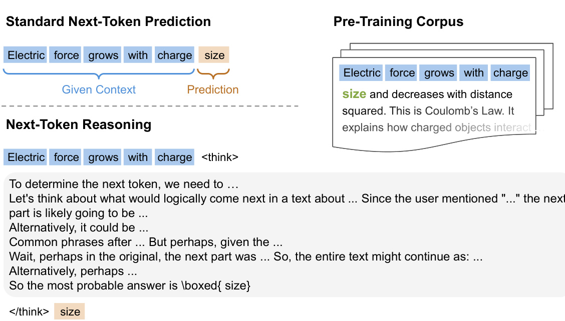 图1:RPT将下一个token预测转化为推理任务,通过强化学习激励模型思考
