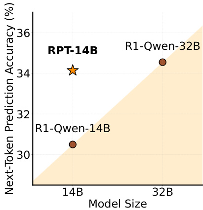 在OmniMATH验证集上,RPT-14B在不同难度token上的预测准确率全面超越基线模型: