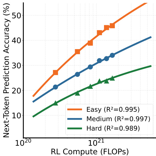 所有难度级别的R²值均超过0.98,表明RPT具有稳定的扩展能力。随着计算资源增加,模型在困难token上的准确率提升尤为显著(+17.2%)。