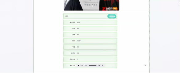 用户点击音乐信息;在音乐信息页面的搜索栏输入歌名、音乐类别,进行查询,然后查看歌名、音乐类别、封面、歌手、语言、音乐文件、MV、时长、专辑、发行方、点击次数等信息,也允许点击播放、收藏或者评论等操作;如图5-3所示。