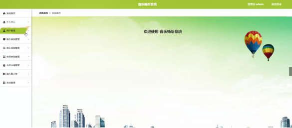管理员登录到音乐畅听系统可以查看系统首页、个人中心、用户管理、音乐类别管理、音乐信息管理、会员类别管理、会员充值管理、音乐聊天室、系统管理等能力进行详细运行,如图5-7所示。