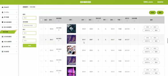 音乐信息管理:管理员可以上传、更新和删除音乐信息,包括歌名、歌手、专辑、时长等。