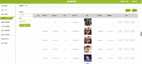 管理员点击用户管理;在用户管理页面输入用户账号、用户姓名、性别、用户电话、头像、会员类别、到期时间等信息,进行查询,新增或删除用户信息等操作;如图5-8所示。
