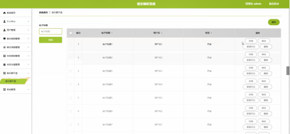 管理员点击音乐聊天室;在音乐聊天室页面对帖子标题、用户名、状态等信息,进行查询或删除音乐聊天室等操作;如图5-13所示。