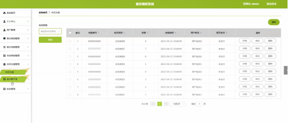 管理员点击会员充值管理;在会员充值管理页面对充值编号、会员类别、价格、充值时间、用户姓名、是否支付等信息,进行查询或删除会员充值等操作;如图5-12所示。