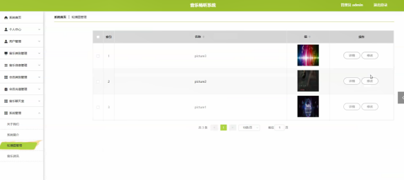 管理员点击系统管理;在系统管理页面对关于我们、框架简介、轮播图管理、音乐资讯等信息,进行查询或删除系统信息等操作;如图5-14所示。