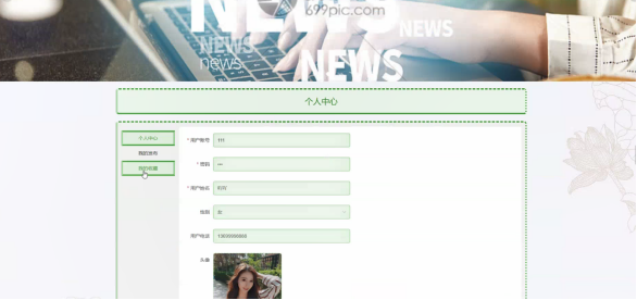 在个人中心页面可以输入个人详细信息,进行信息更新执行,还可以对我的发布、我的收藏进行详细操作,如图5-5所示: