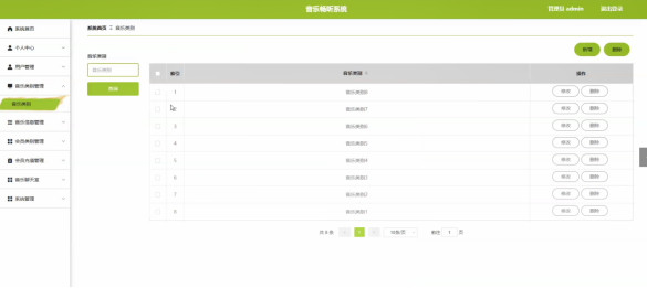 管理员点击音乐类别管理;在音乐类别管理页面输入音乐类别等信息,进行查询,新增或删除音乐类别等操作;如图5-9所示。