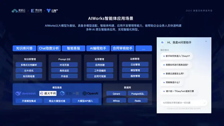 - AI 基础设施层:集成 DeepSeek、Qwen 等主流大模型,搭配英伟达 H20、昇腾 910B 等不同硬件,可根据业务场景复杂度灵活选择合适模型与算力,为 AI 应用提供 “最强大脑” 支持。