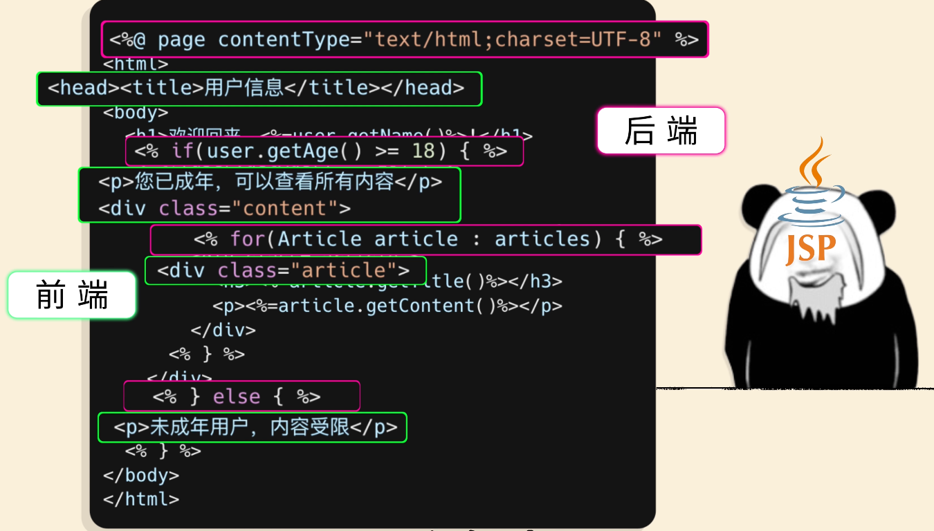 你使用的开发技术是比你年龄都大的 JSP,它的特点是把前端 HTML 网页代码和后端 Java 代码混在一起写。