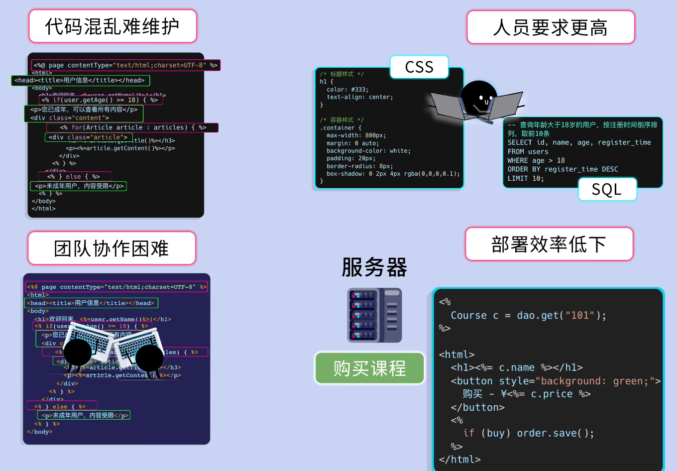 代码混乱难维护:前端后端代码纠缠在一起,不利于阅读,也不利于排查 Bug。