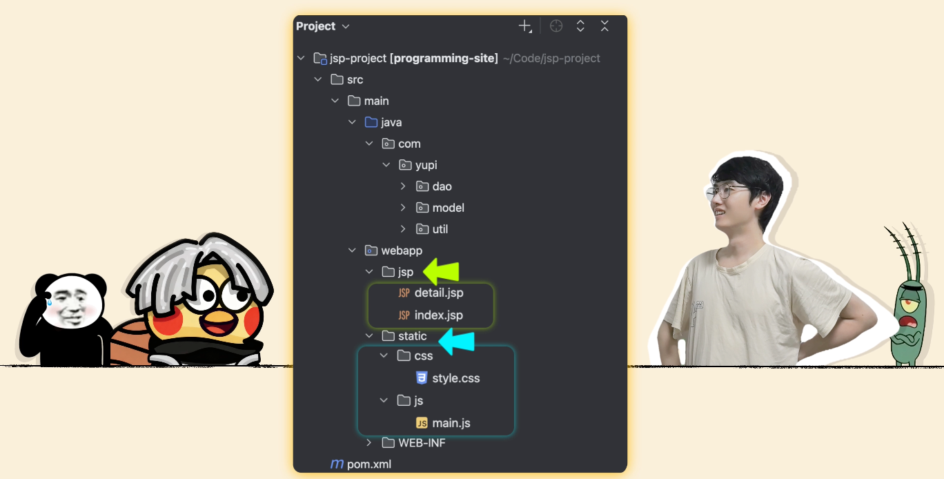 这时,你的同事阿土申插嘴道:我知道啊!我们现在把前端静态文件放在 static 文件夹,JSP 代码放在 jsp 文件夹,这不就是前后端分离吗?