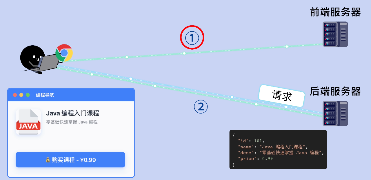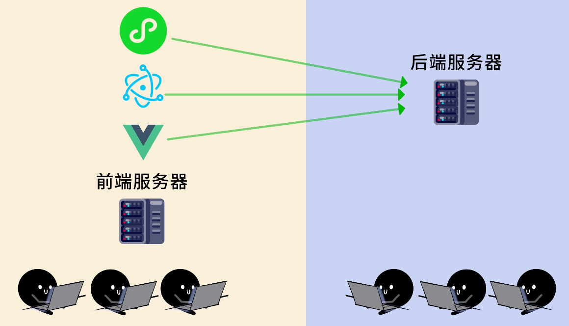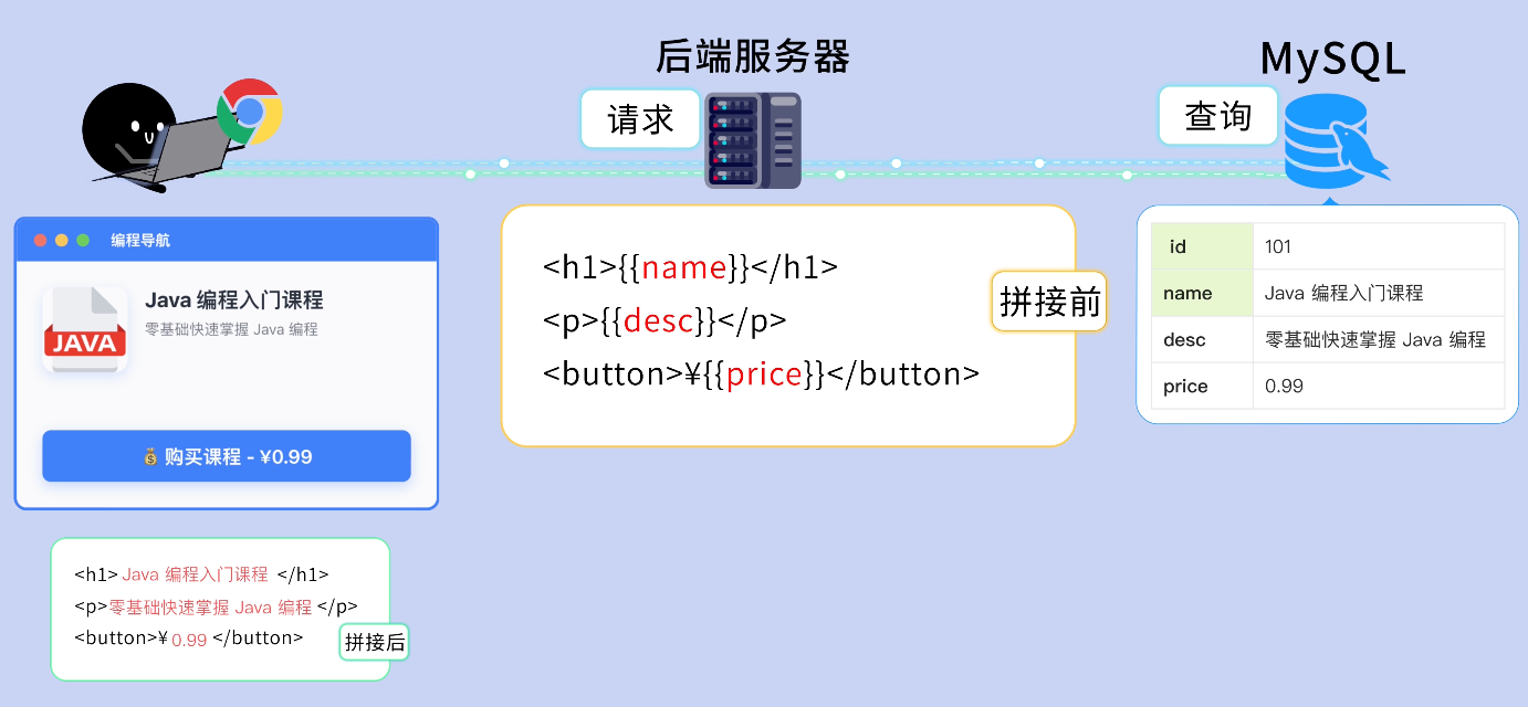 看看你们现在的项目,用户访问网站时,是由后端服务器接收请求,然后在后端查询数据并拼接到 HTML 网页模板中,生成完整的网页,最后再返回给用户。