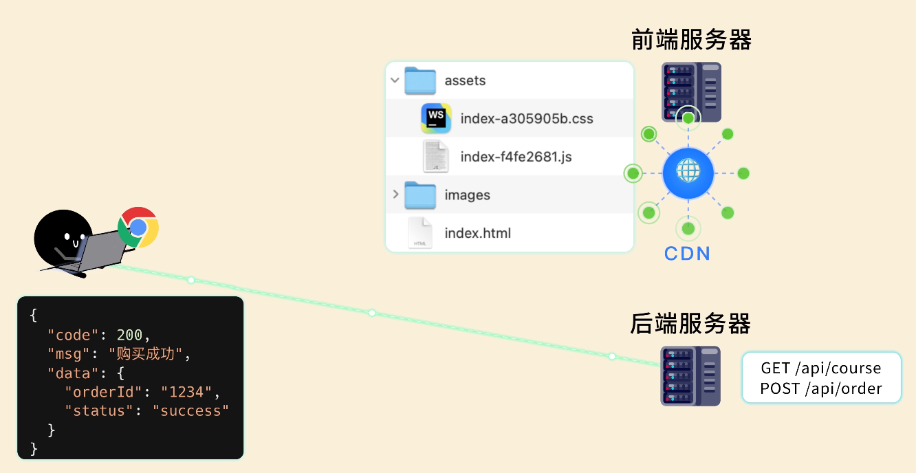 于是你带领团队开始重构项目,前端用 React 框架重写了整个界面,打包成静态文件部署到 CDN 加速网络上;后端则专门提供 API 接口,返回 JSON 数据,部署在独立的服务器上,互不影响。