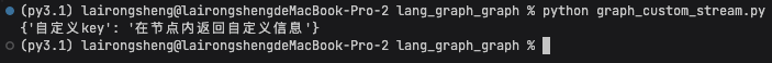 class State(TypedDict):query: stranswer: strdef node(state: State):writer = get_stream_writer()writer({"自定义key": "在节点内返回自定义信息"})return {"answer": "some data"}graph = (StateGraph(State).add_node("node", node).add_edge(START, "node").compile()
