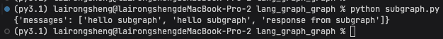 graph = builder.compile()print(graph.invoke({"messages": ["hello subgraph"]}))