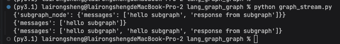 graph = builder.compile()for chunk in graph.stream({"messages": ["hello subgraph"]}, stream_mode="updates"):print(chunk)