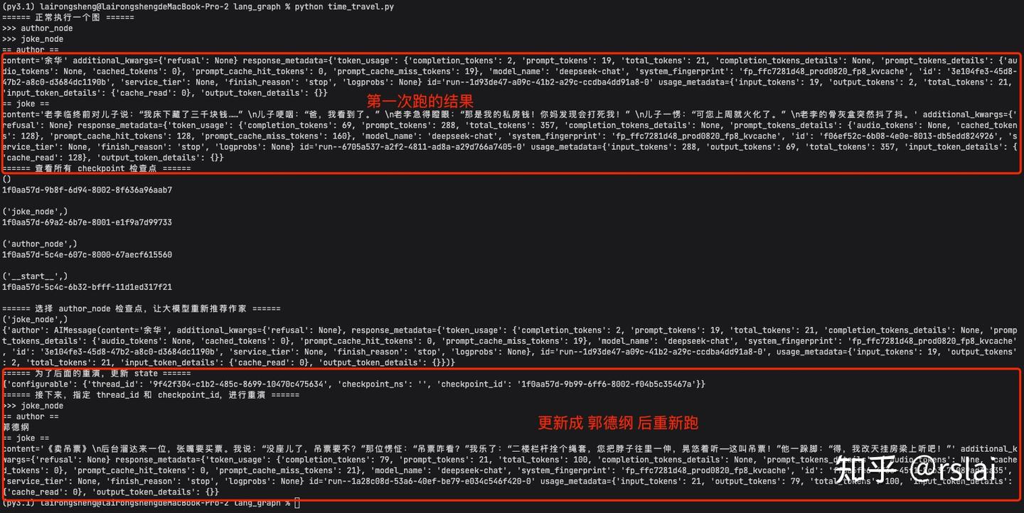 由于大语言模型回答的不确定性,基于大语言模型构建的应用,也是充满不确定性的。而对于这种不确定性的系统,就有必要进行更精确的检查。当某一个步骤出现问题时,才能及时发现问题,并从发现问题的那个步骤进行重演。为此,LangGraph 提供了 Time Travel (时间回溯)功能,可以保存 Graph 的运行过程,并可以手动指定从 Graph 的某一个 Node 开始进行重演。