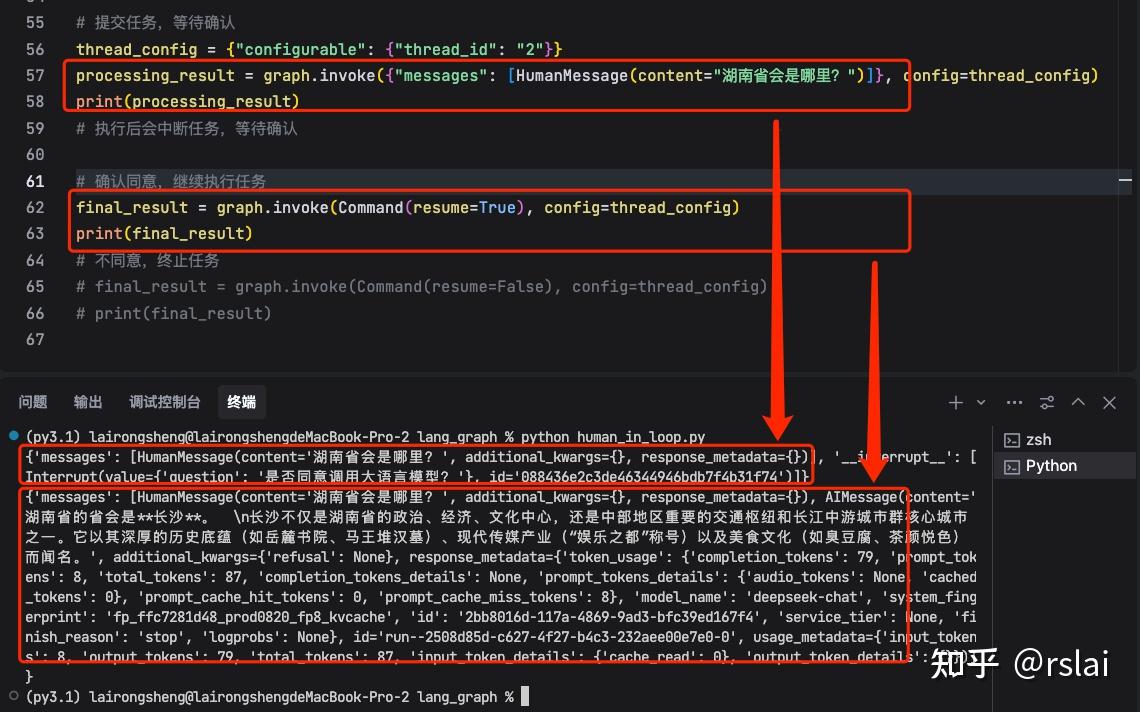 - 在人类确认之后,使用 Graph 提交一个 resume=True 的 Command 指令,恢复任务,并继续进行。