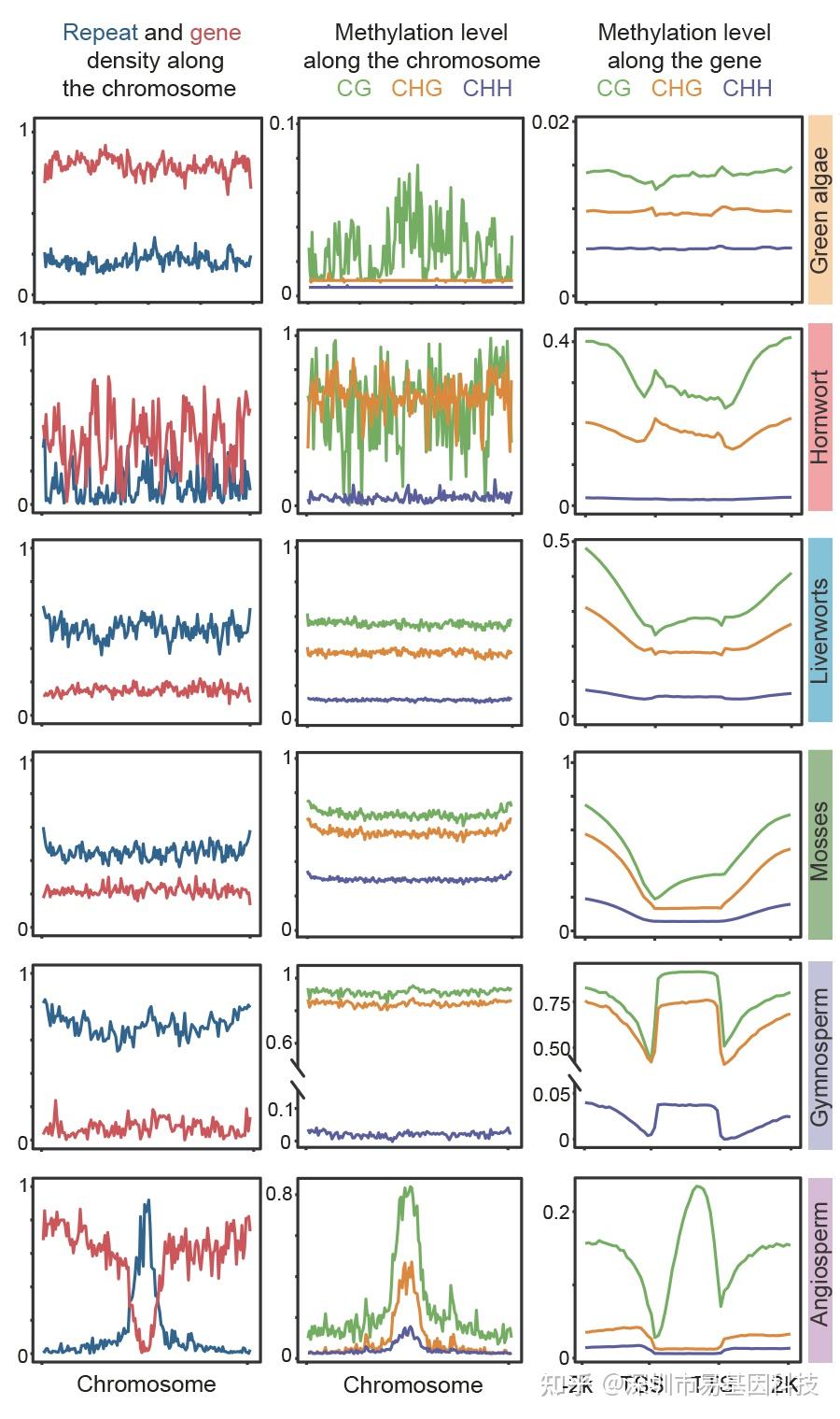 图3:WGBS描述不同植物谱系中染色体上以及基因及其侧翼区域的重复序列、基因密度和DNA甲基化水平。