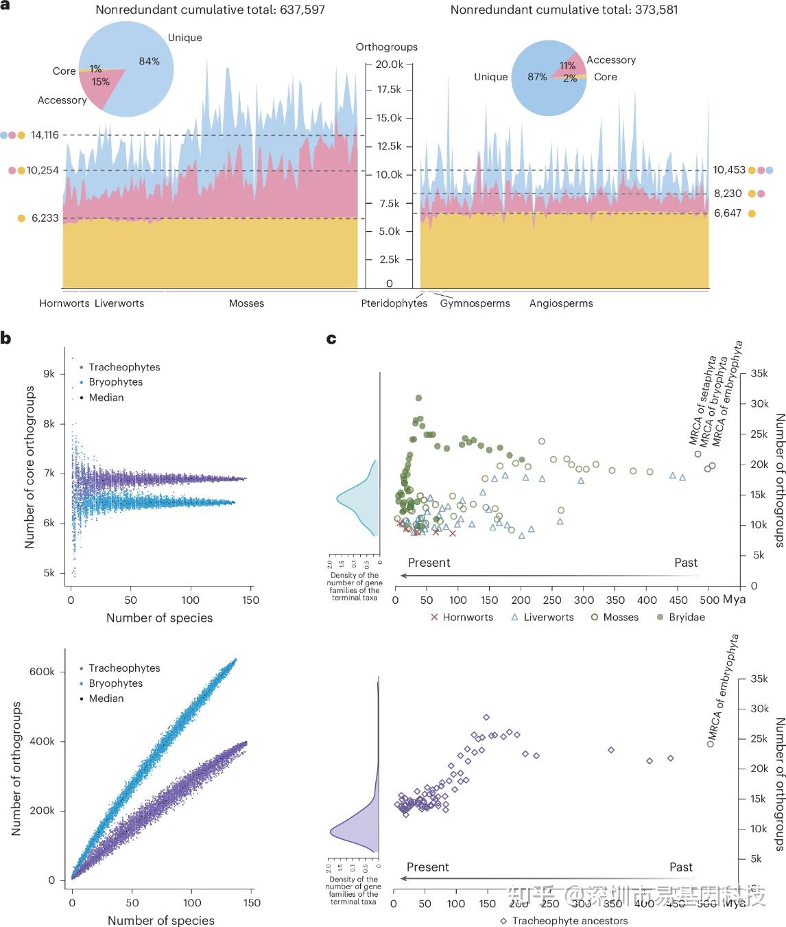 图2:苔藓植物和维管植物的泛基因组比较分析。