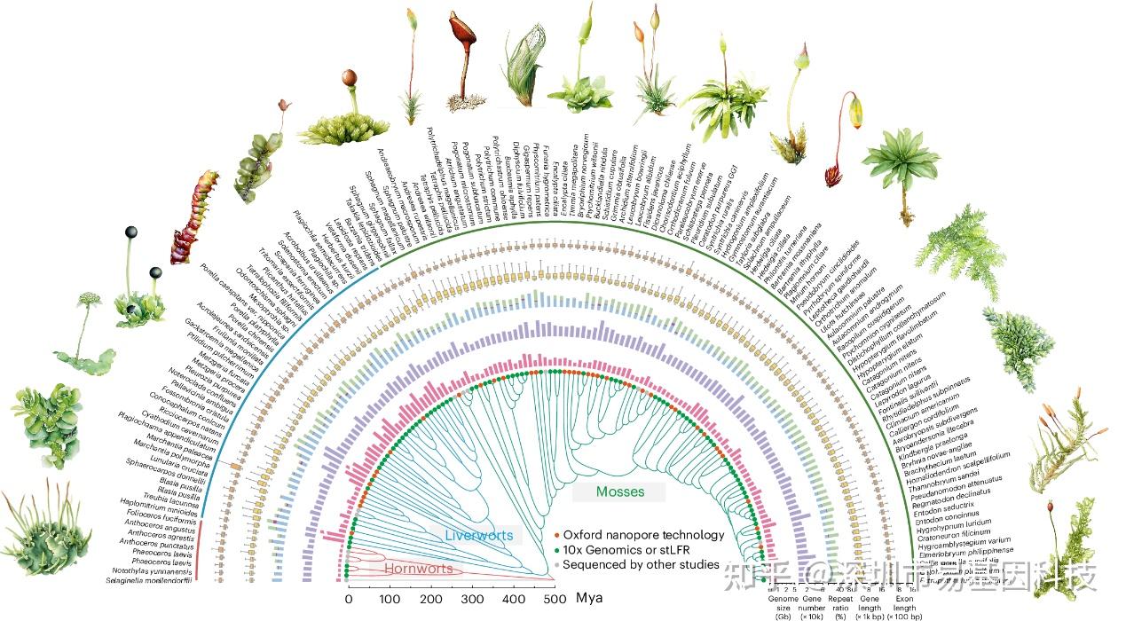 基于对绿色植物的190个分类bin进行的系统发育分析,其分化时间基于对苔藓植物的分子定年分析。分支和物种名称按三大类苔藓植物用颜色突出显示。从内到外,五个通道分别表示基因组大小、基因数量、重复序列比例(基因组中重复序列百分比,其中蓝色、紫色和绿色条带分别代表LTR、LINE和未知重复序列)、基因长度和外显子长度。