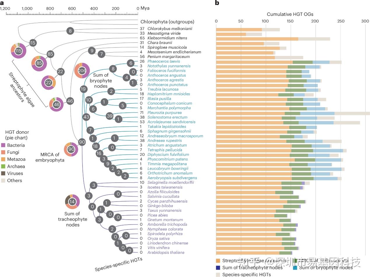 a.链型植物系统发育时序图上水平基因转移事件数量的总结(苔藓植物以蓝色表示,维管植物以紫色表示),灰色圆盘中的数字表示在某个节点重建的HGT事件总数。饼图显示在选定的祖先节点和特定支系(即包括所有苔藓植物或维管植物内部节点的数据)中,HGT推定供体在主要类别间的分布情况。末端分支旁的数字指数据集中该末端种群特有的HGT。